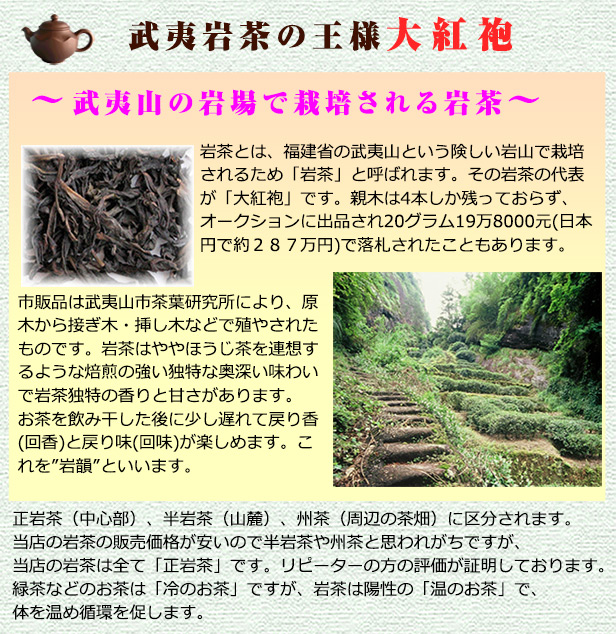 ★武夷岩茶の王様!体を温める"温のお茶"です。★ 【正岩武夷岩茶 大紅袍 40g】 価格 1,019 円 (税込 1,100 円) 岩茶とは、福建省の武夷山という険しい岩山で栽培されるため「岩茶」と呼ばれます。その岩茶の代表が「大紅袍」です。当店の「大紅袍」は正岩茶です。原茶樹は樹齢350年以上で、”天心岩”の九竜窟壁の上に4本残っています。年800グラム程度しか収穫できないため市販されることはありません。以前は、国で管理され番人までいました。 オークションに出品され20グラム19万8000元(日本円で約287万円)で落札されたこともあります。市販品は武夷山市茶葉研究所により、原木から接ぎ木・挿し木などで殖やされたものです。 ■名前の由来は、いくつかの伝説として伝えられています。「皇帝が近くを通った時に病気になり、僧侶がこのお茶を飲ませて回復し、皇帝は僧としての最高位を現す紅の衣を贈った”という説や、「高僧が病気になり、このお茶で治った」ので自分の紅の衣をこの木にかけ祈った”などという名前の由来の伝説です。岩茶は、ややほうじ茶を連想するような焙煎の強い独特の奥深い味わいで岩茶独特の香りと甘さがあります。また、お茶を飲み干した後に少し遅れてドーンと襲ってくる戻り香(回香)と戻り味(回味)が楽しめます。これを”岩韻”といいます。 岩茶は作られる場所で等級分けされ、正岩茶(中心部)、半岩茶(山麓)、州茶(周辺の茶畑)に区分されます。 安いものは、半岩茶や州茶ですが、当店の岩茶は「正岩茶」です。 「大紅袍」、「鉄羅漢」、「水金亀」、「白鶏冠」が四大岩茶です。ぜひお試し下さい。 中国には「陰陽論」という考え方があり、肉は「陽性」として”熱”を持ち、緑茶は「陰性」の”寒”という考え方から、肉を食べたあとには緑茶を飲むと体内の熱を取るので良いといわれます。 一般の緑茶や烏龍茶は「冷のお茶」ですが、岩茶は「陽性」の「温のお茶」なのです。体が暖まり体の循環を促し、冷え性や血圧低下などに良いとされてきました。 |